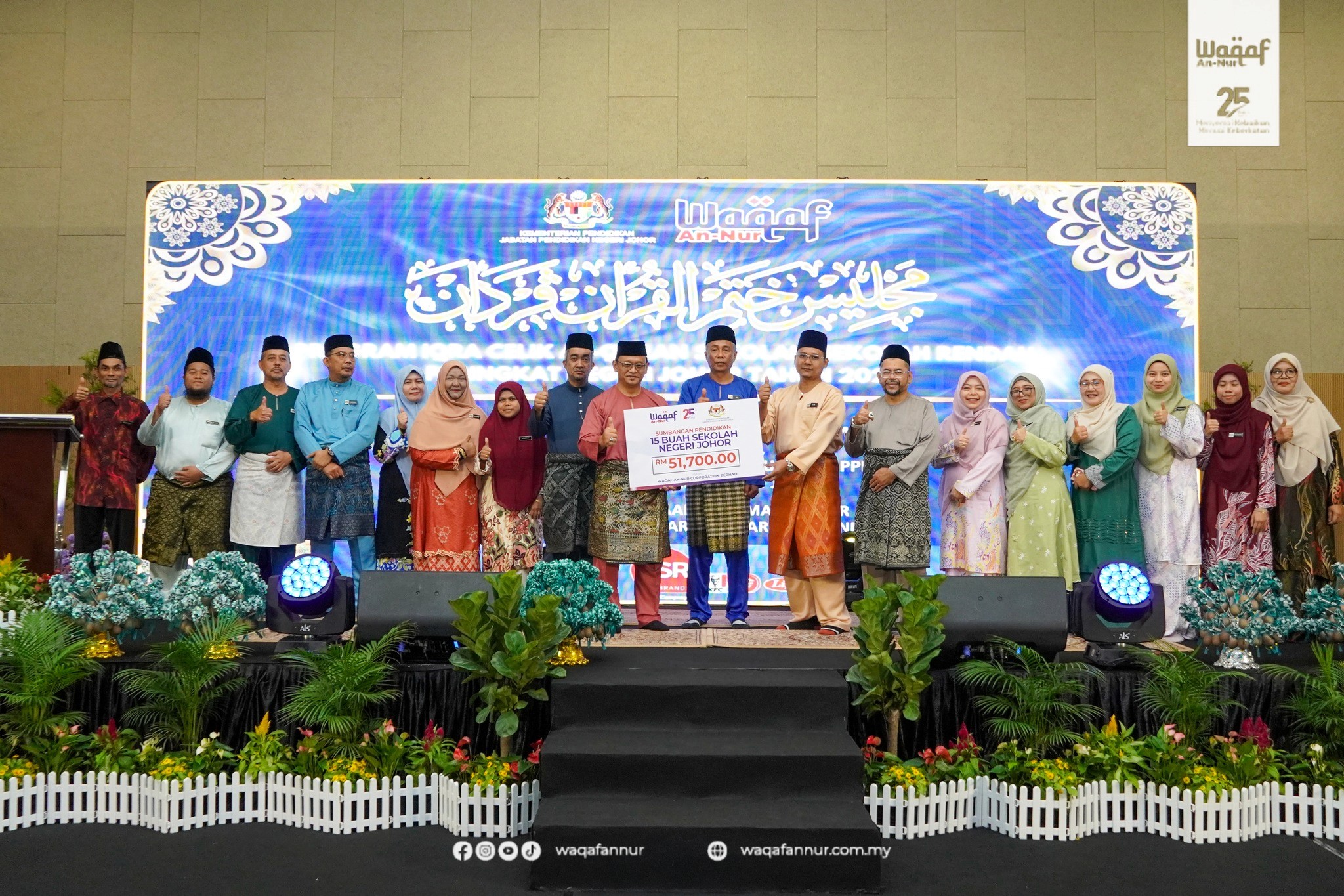 Bersempena Majlis Khatam Al-Quran, Waqaf An-Nur telah menyalurkan sumbangan berjumlah RM51,700 kepada 15 buah sekolah di Negeri Johor bagi pelbagai kegunaan, selaras dengan permohonan pihak sekolah.